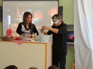 Tutti i bambini si sono ritrovati, a metà mattinata, nell’atrio della scuola, per divertirsi un po’ e preparare la deliziosa torta di mele di zia Rosetta , con il burro di Cappuccetto Rosso, la farina di mamma capra, le uova della gallinella, lo zucchero della casa di marzapane della strega di Hansel e Grete, le mele di Biancaneve.